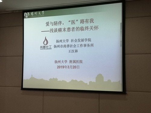 启动会邀请了扬州大学社会发展学院王汉林教授作题为“爱与陪伴,‘医’路有我”的主题培训。王教授深入浅出的讲解了医务社会工作产生的缘起、定义及内容,医务社会工作的方法、价值和伦理等方面的知识,同时以专业角度,结合临终关怀的项目讲解了开展工作的方法及技巧。通过王教授的讲解,与会人员对“医务社工”有了更全面的了解,对开展各项工作具有帮助作用。