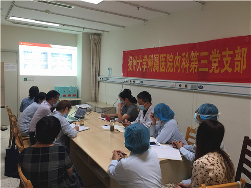 会上,内科三支部组织委员季梅同志带领大家学习了《姚冠新书记在2020年学校全面从严治党工作会议上的讲话》;纪律委员刘申香同志带领大家重温入党誓词,并进行了《基层党员需要正视的几个问题》专题学习。陶玉坚同志向党员通报了近期支部“三会一课”进行的情况,以及近两年来支部所取得的成绩。他说,近两年来,支部在全体党员的共同努力下,取得了一些成绩。其中《幸福始于呼吸,防治从基层做起》获得扬州大学“最佳党日活动”奖;支部被评为扬州大学附属医院“先进基层党组织”;陶玉坚的《高校附属医院支部建设的现状与对策思考》荣获扬州大学党建研究会优秀论文二等奖。支部还申报《关于加强医疗基层党组织生活有效性研究》课题、申报《从平凡到逆行,党建引领,责任同行》组织工作创新奖。