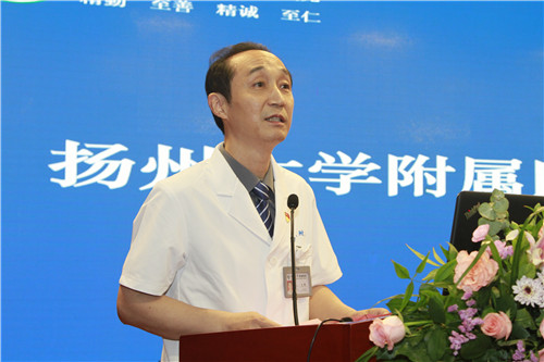 沈洪兵致辞。沈洪兵代表南京医科大学对扬州大学附属医院60周年院庆表示热烈祝贺。他回顾了2005年来到扬大附院作报告的经历,对医院经过十几年的发展,从扬州市第一人民医院到扬州大学附属医院、从市级医院到省管医院、从普通的教学基地到大学的附属医院,在医教研各个方面取得的成绩表示赞赏,对医院作为南京医科大学的教学基地,为学校人才培养作出的贡献表示感谢。他介绍了江苏省肿瘤个体化医学协同创新中心自成立以来,通过基础医学、临床医学和公共卫生预防医学的紧密结合,在个体化预防、诊断、治疗等方面的发展情况和取得的成绩。同时他表示,江苏省肿瘤个体化医学协同创新中心的分中心,是目前临床研究的一个非常重要的模式,希望扬大附院作为第一个分中心,能够强化南京医科大学与扬州大学的联系,帮助两所高校建立更进一步的紧密关系,在人才培养、科技创新、临床技术等方面取得协同创新的成效,为肿瘤个体化、精准医疗作出贡献,真正地服务于扬州老百姓的健康。