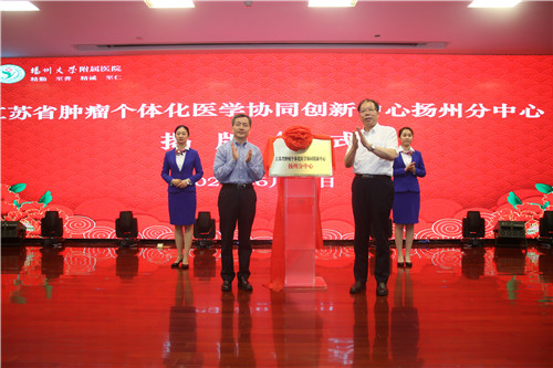 沈洪兵、姚冠新共同为江苏省肿瘤个体化医学协同创新中心扬州分中心揭牌。
