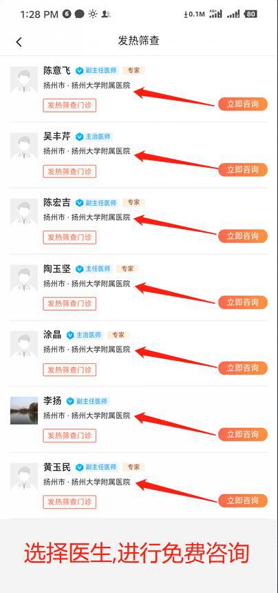 现代快报讯(通讯员 傅轩 记者 顾潇)1 月 26 日,扬州大学附属医院发热筛查线上咨询门诊正式上线,首批 13 名具有副高以上职称的医生将在线上接受市民问询。发热患者可以通过 " 爱加健康 "APP 即可与医院进行实时在线问诊咨询,足不出户,更为安全。