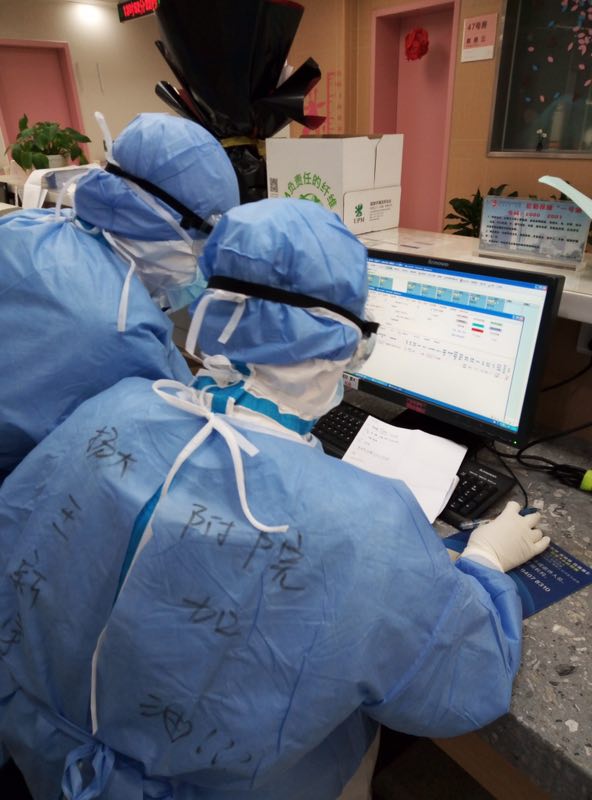 不知不觉车已到武汉第一医院,下车前王新宇做了做深呼吸。大家有条不紊的领取了防护用品之后,开始穿防护服。“你的帽子没遮住额头”“你的眼罩戴歪了”就这样,同一班上岗的医疗队战友们给彼此当镜子,穿戴整齐后大家从半污染区到了缓冲区后直接到了污染区,一番交接之后,王新宇领到了来武汉的第一个任务,管9个病人。