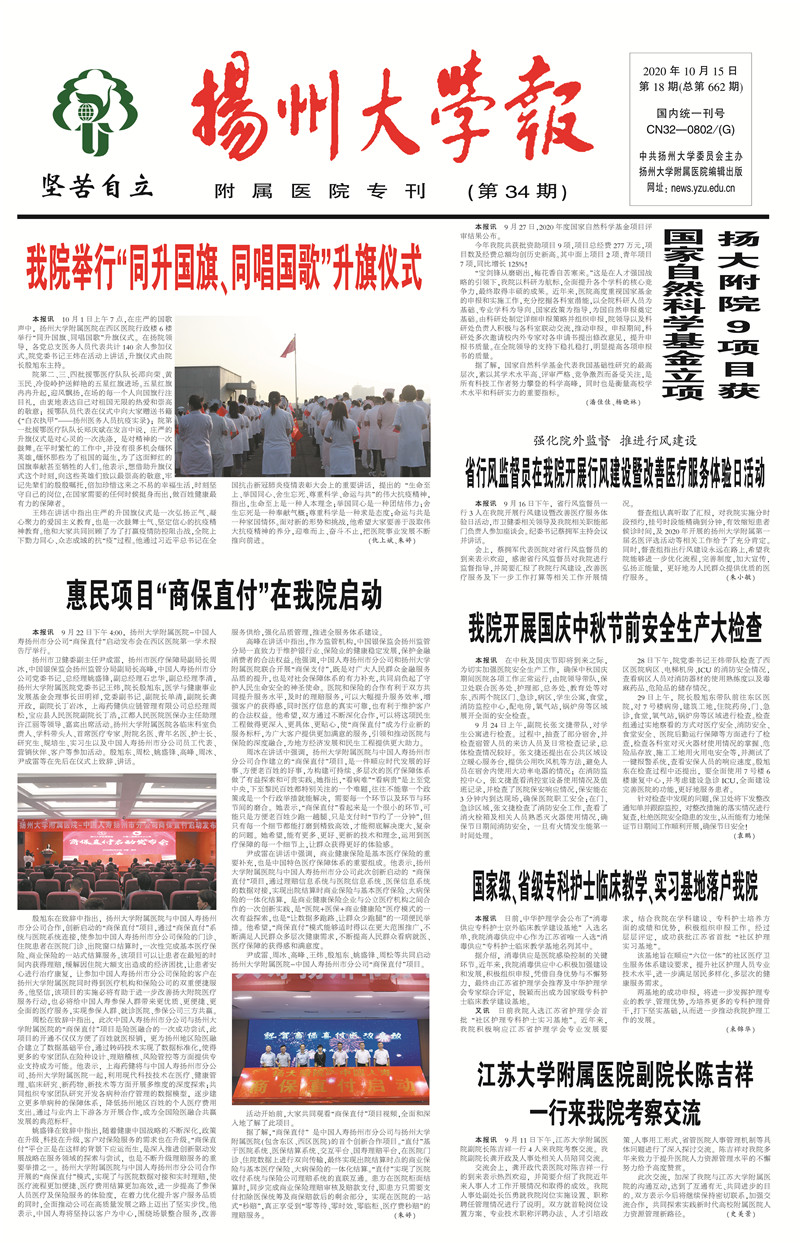 《扬州大学报•附属医院专刊》第34期(总第662期)(2020年10月15日第1版)
