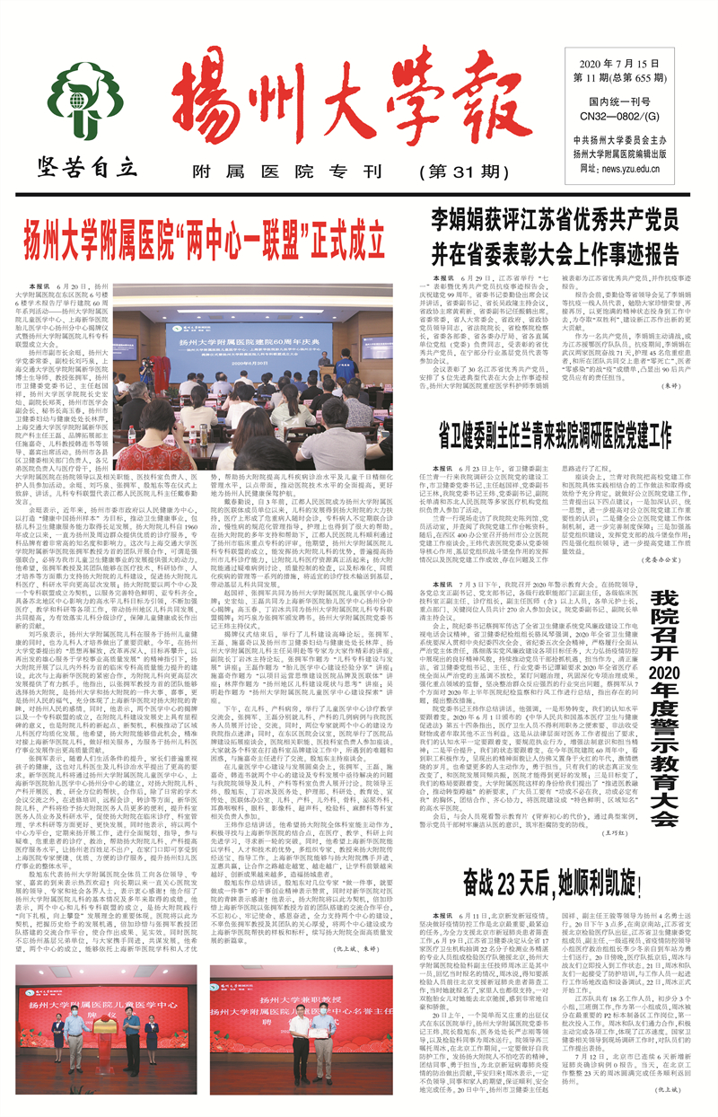 《扬州大学报•附属医院专刊》第31期(总第655期)(2020年7月15日第1版)